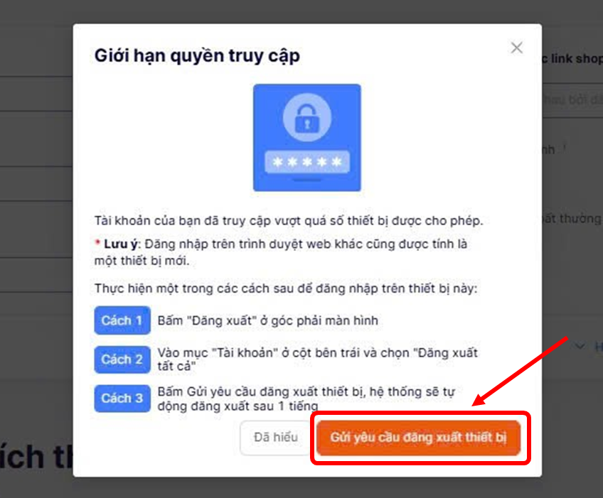 * *Nếu bạn gặp trường hợp bị giới hạn thiết bị nhưng không kiểm soát được các thiết bị đăng nhập, bạn nên sử dụng* [*cách 3*](#cach-3-bam-gui-yeu-cau-dang-xuat-o-popup-gioi-han-thiet-bi)*. Với cách này, hệ thống sẽ tự động đăng xuất sau khoảng 01 tiếng.*